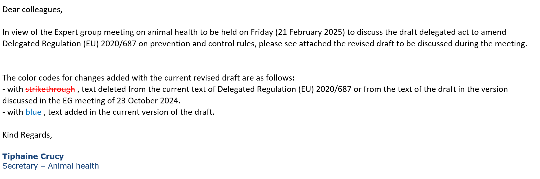 Det reviderede forslag af 21.02.2025 til forordning (EU) 2020/687 har været præsenteret på et EU ekspertgruppemøde den 21. februar 2025. Forud for forslaget af 21. februar har der været 3 foregående forslag til revision af forordning (EU) 2020/687 præsenteret på EU ekspertgruppemøder hhv. den 13. september 2023, den 13. november 2023 og den 23. oktober 2024. Fødevarestyrelsen foretog i den forbindelse også høring af de 3 foregående forslag på Høringsportalen.